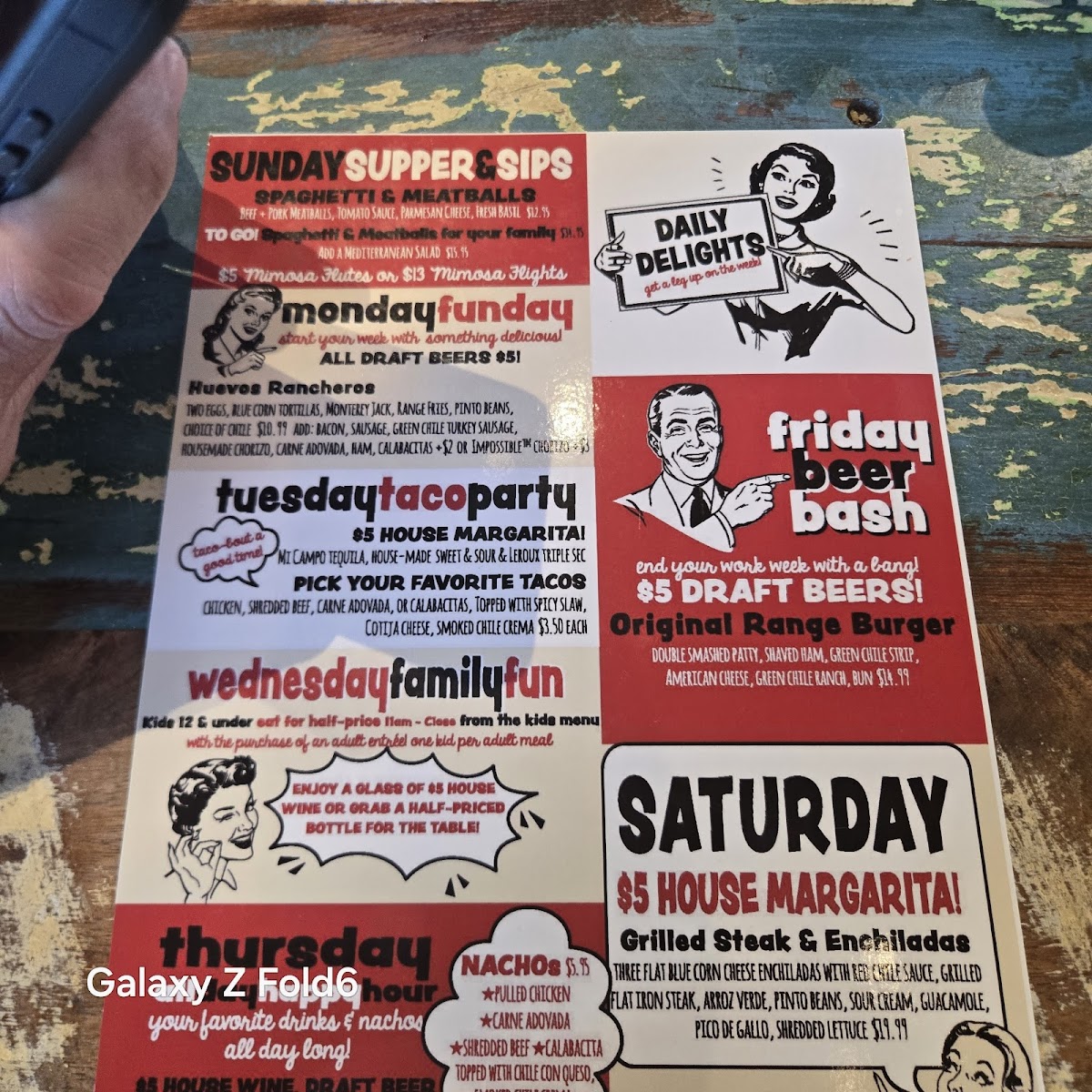 Finally, the tacos at The Range Café are a great way to explore bold flavors, with options like Tacos Beef, Carne Adovada, Chicken, Crispy Tofu, and the adventurous Red Chile Tequila Shrimp.