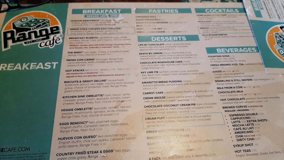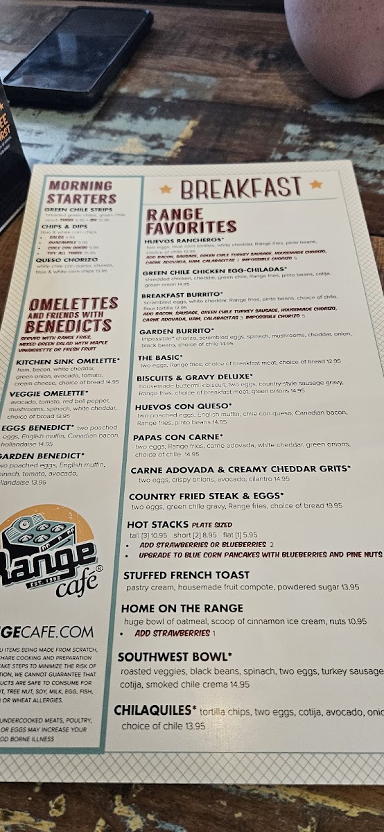 The Range Café, located at 1050 Rio Grande Blvd NW, Albuquerque, NM 87104, offers a diverse and exciting menu that caters to a wide variety of tastes. For breakfast, guests can enjoy the comforting Blue Corn Pancakes or the hearty Breakfast Burrito. For something with a bit more flair, the Chilaquiles or Churro French Toast Sticks are fantastic options, while the classic Eggs Benedict never disappoints.